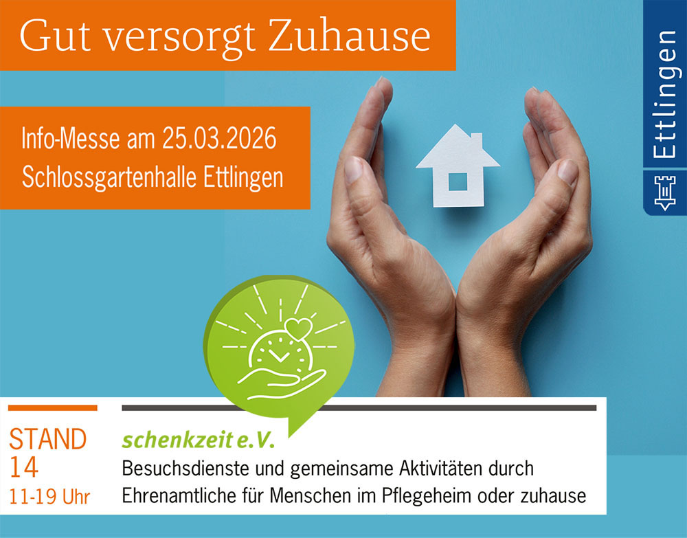Am 25. März 2026 ist schenkzeit auf der Sozialmesse „Gut versorgt zuhause“ in Ettlingen vertreten. Besuchen Sie unseren Stand 14 und erfahren Sie, was hinter der Idee des Zeit-Schenkens steckt. Die Köpfe von schenkzeit, Bärbel und Jörg Konstandin, sind persönlich vor Ort, erzählen von ihren Erfahrungen und zeigen, wie aus kleinen Gesten echte Gemeinschaft entstehen kann. Sie informieren direkt über das Konzept, beantworten Fragen und zeigen, wie einfach es sein kann, Zeit zu schenken oder Unterstützung zu finden.